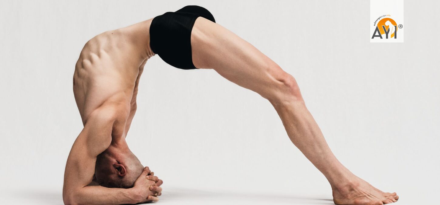Hebe einatmend die gestreckten Beine in den Kopfstand. Setze ausatmend die Füße hinter dem Kopf in der tiefen Rückbeuge auf. Versuche, die Knie zu strecken. Verbleibe bis zur fünften Ausatmung in der Haltung.