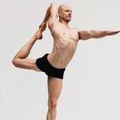 Tipp: Der Wechsel vom seitlichen Griff in die Rückbeuge braucht Übung. Greife dafür zunächst die Außenkante des Fußes zwischen Daumen und Zeigefinger; die Handfläche zeigt nach außen, der Daumen nach oben. Beuge das Knie und rotiere das Bein nach hinten, während Du den Ellenbogen beugst und nah an der Flanke hältst. So kannst Du den großen Zeh in Richtung Schulter führen. Von dort lässt sich der Ellenbogen deutlich leichter anheben, und der Griff bleibt stabil.