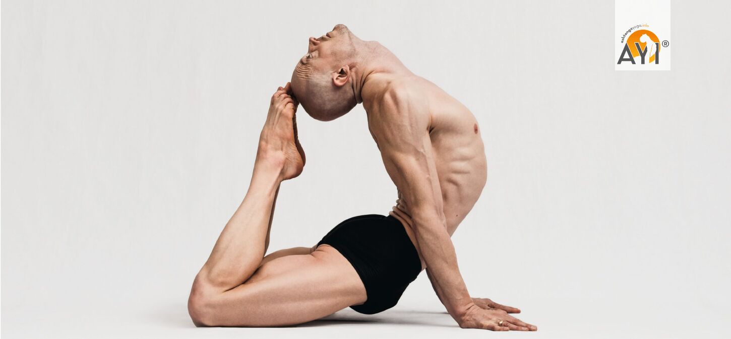 Wirkung: Rāja Kapotāsana dehnt intensiv die Vorderseite der Hüfte (Hüftbeuger/Quadrizeps), öffnet Brustkorb und Schultergürtel und kräftigt zugleich Rückenlinie und Gesäß, damit die Rückbeuge getragen bleibt.