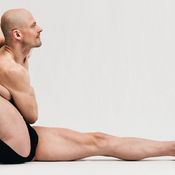 Tipp: Das Vorschieben des rechten Fußes unter die linke Achselhöhle ist im Sitzen anspruchsvoll. Leichter wird es, wenn Du Dich – gleich nach dem Griff mit der rechten Hand am rechten Schienbein – diagonal nach links ablegst. Stütze den linken Arm seitlich auf, den Ellenbogen etwa 90 Grad gebeugt. In dieser Abstützung lässt sich der rechte Fußspann deutlich leichter unter der linken Achselhöhle nach vorne ziehen. Danach kannst Du Dich wieder aufsetzen.