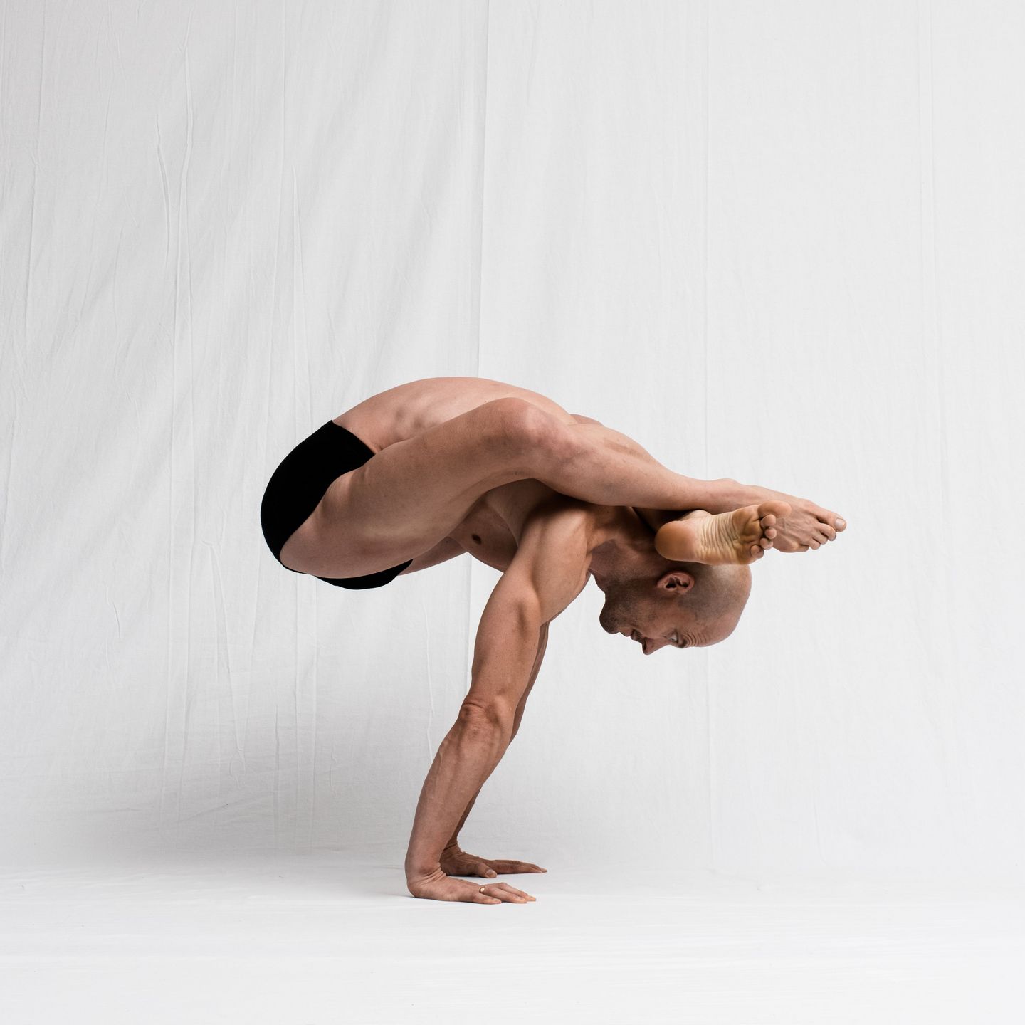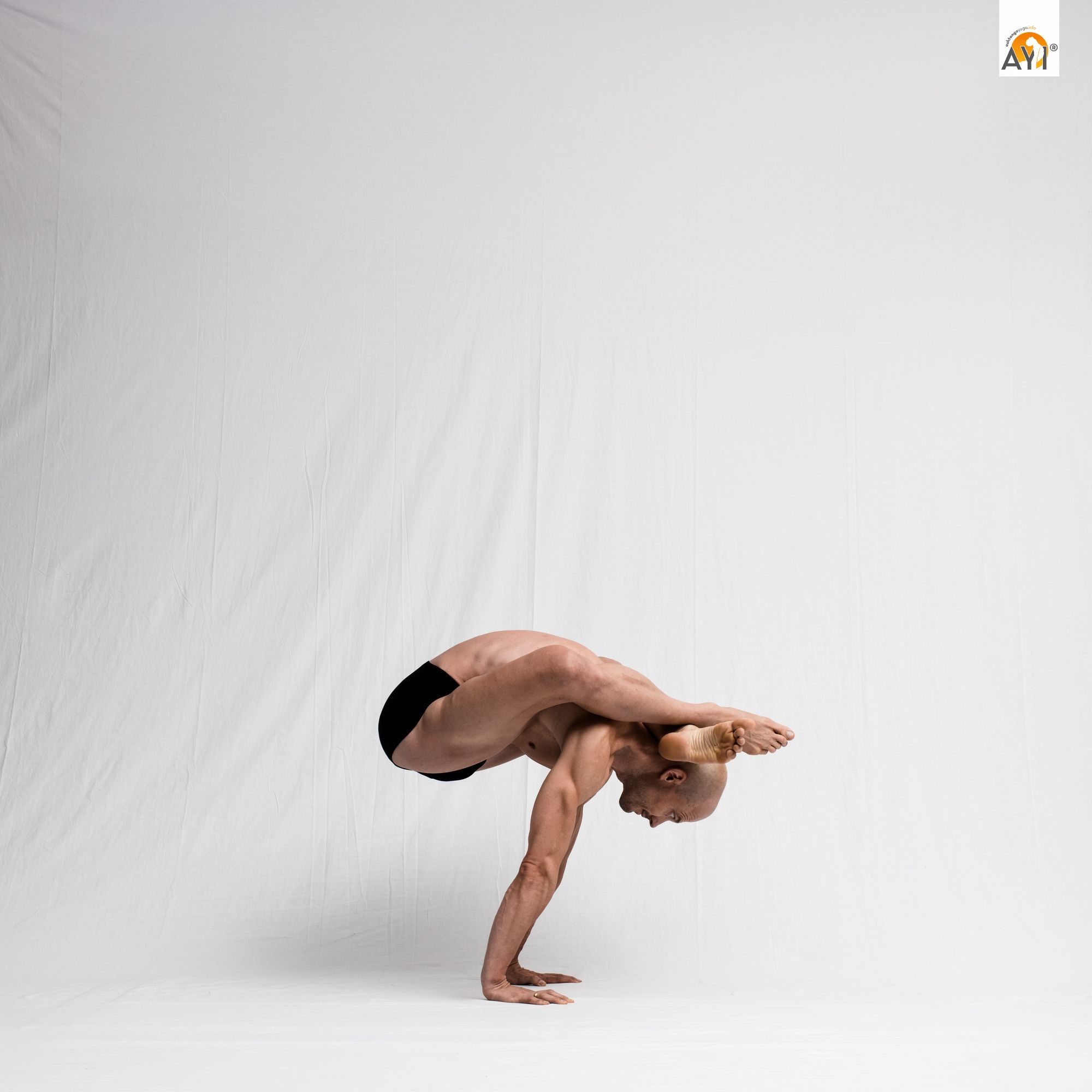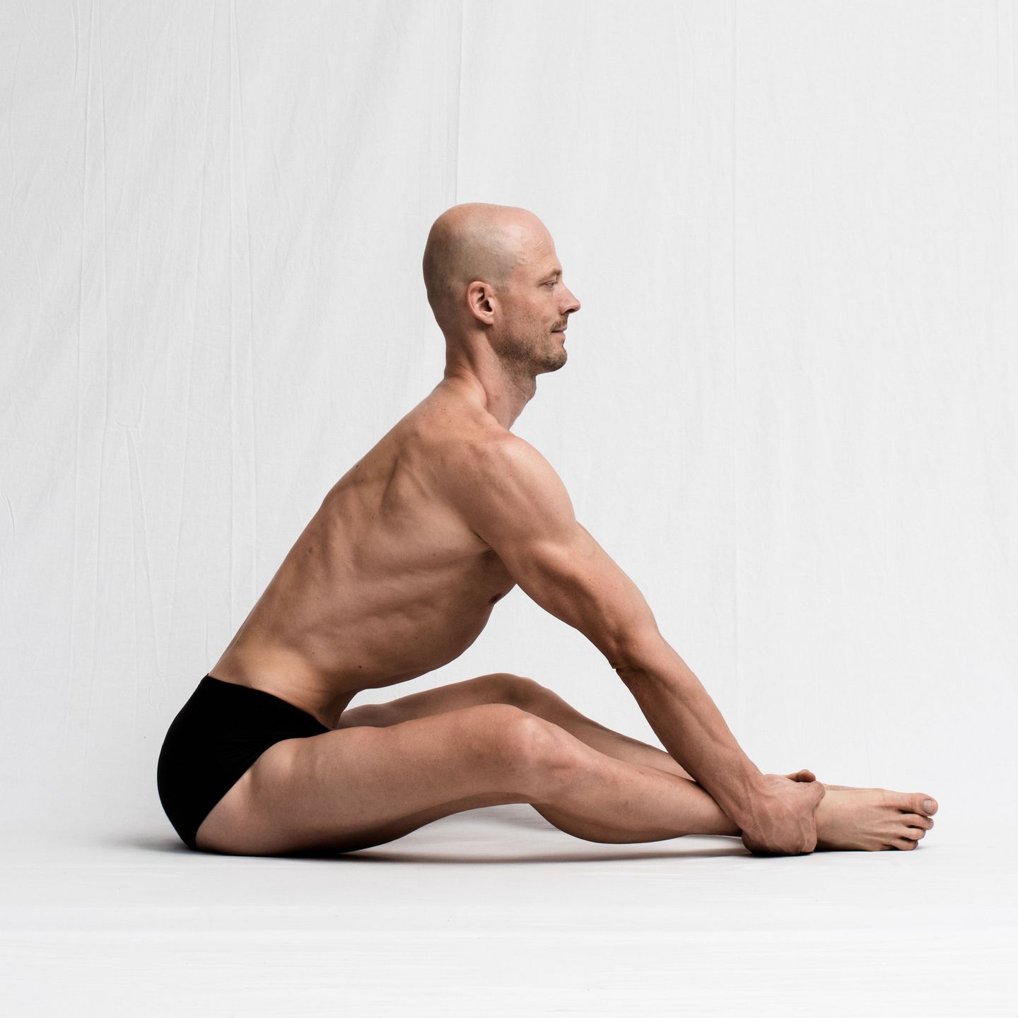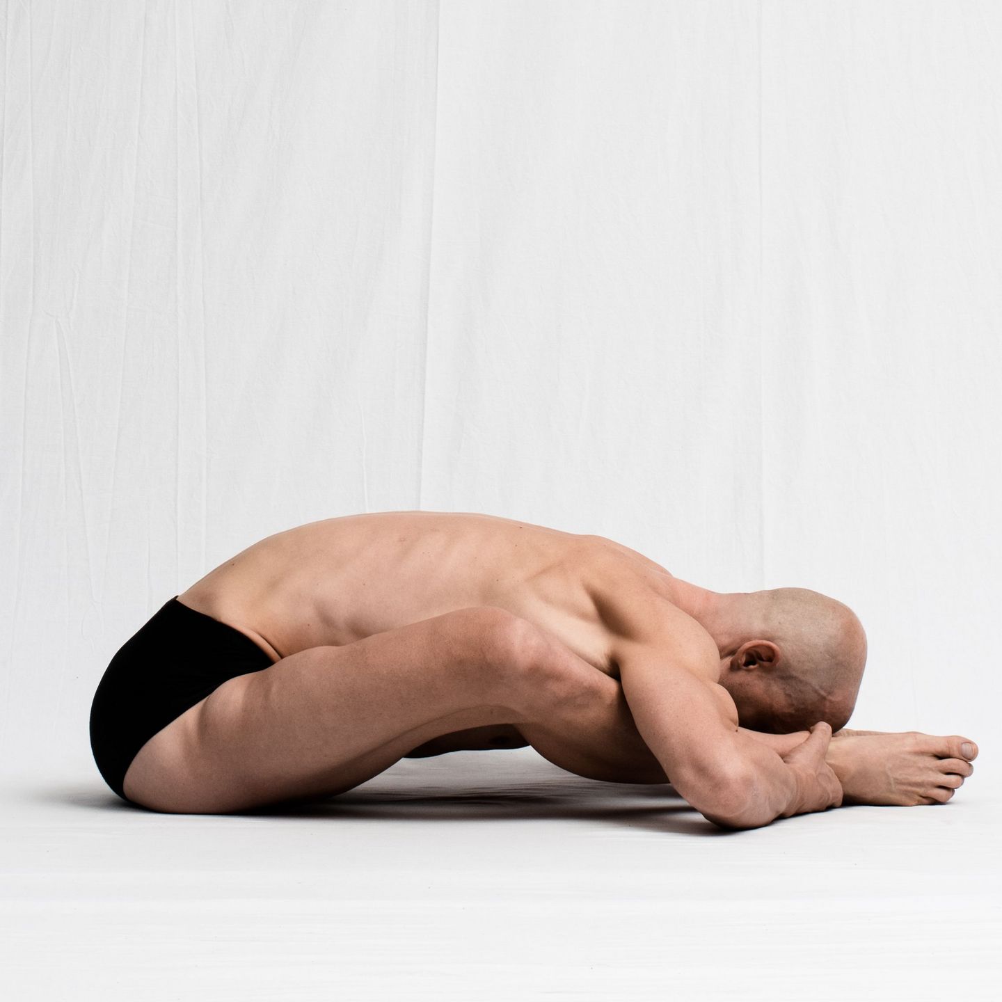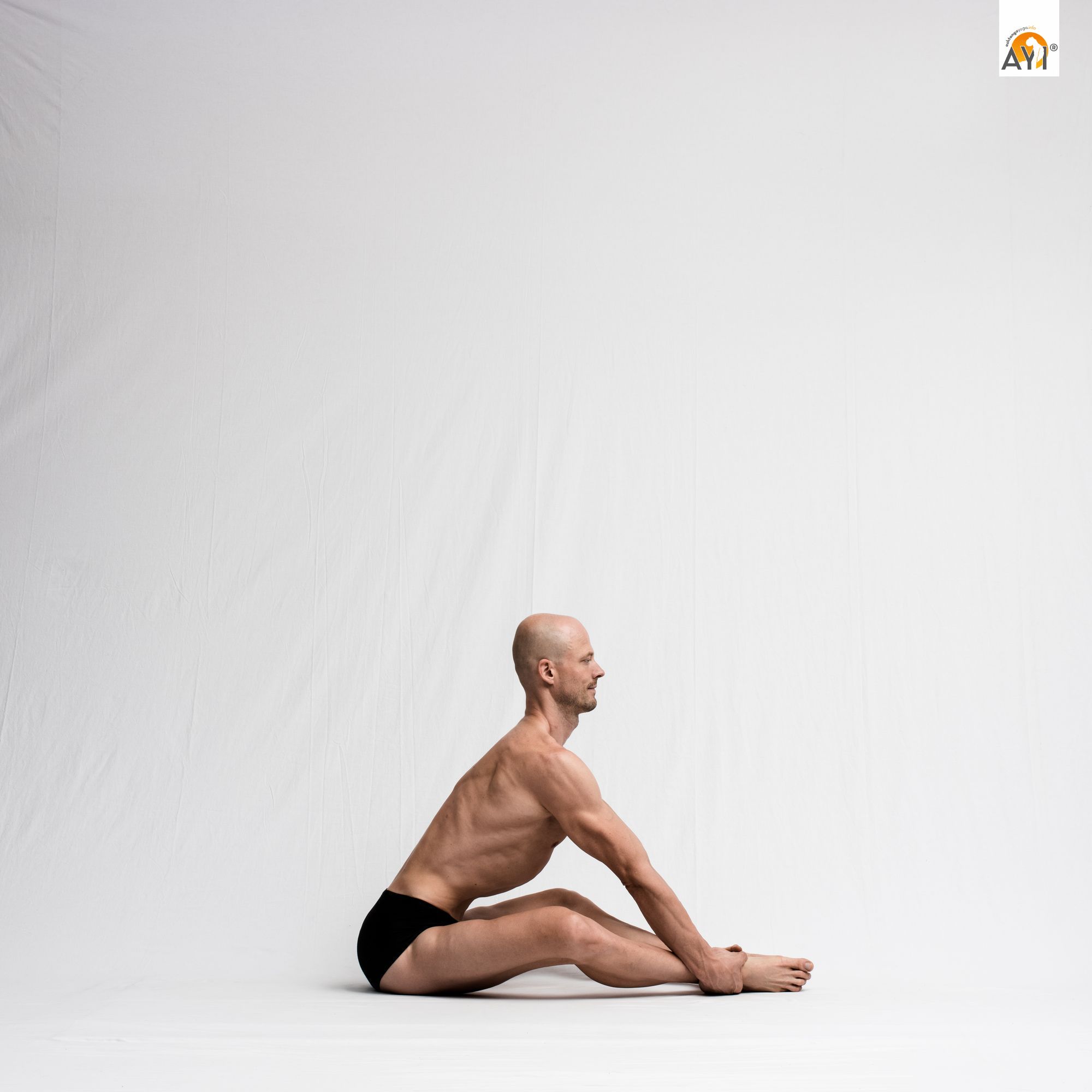 Für die gebundene Haltung der Arme ist es verlockend, unter den Oberschenkeln hindurch zu greifen. Dieser Griff nach hinten erzeugt einen unguten Hebel auf die Schultergelenke und drückt den Oberarmkopf in seiner Gelenkpfanne nach vorne. Befasse Dich deshalb erst mit der gebundenen Armhaltung, wenn Du in der Basic Form mit den Ellenbogen vor den Schienbeinen den Boden berührst. Nun kannst Du die Schulterblätter so weit vor die Oberschenkel schieben, dass der Griff nach hinten mühelos gelingt.